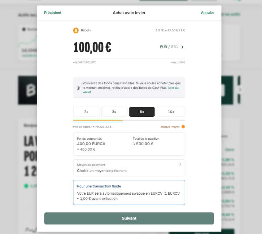 En mettant 100€ et en sélectionnant x5, Bitpanda m’indique que je vais emprunter 400 EURCV (un stablecoin en euros), ce qui permettra d’avoir une position globale de 500€ en Bitcoin.