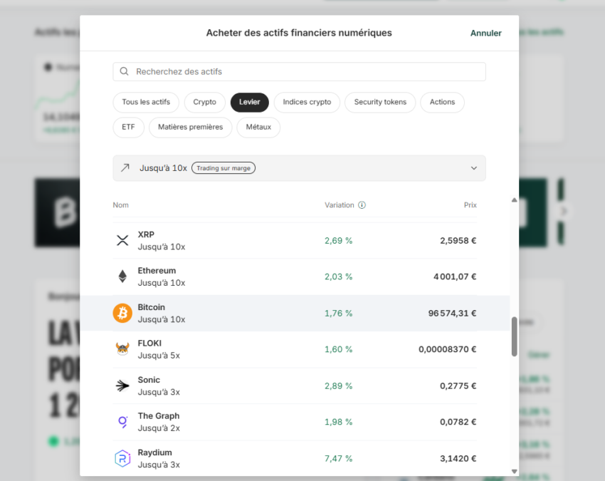 Vous avez alors la liste des actifs disponibles pour le trading sur marge. Pour mon exemple je vais sélectionner le Bitcoin, mais une centaine de cryptos sont disponibles.