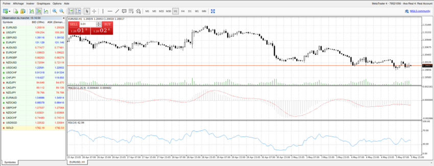 Si vous souhaitez faire vos propres analyses techniques et graphiques, mieux vaudra alors vous tourner vers Meta Trader. Cette plateforme est, pour le coup, une référence dans le domaine. Vous aurez ainsi à disposition tous les indicateurs usuels : moyennes mobiles, ichimoku, MACD, indicateur RSI, bandes de Bollinger et beaucoup d’autres.