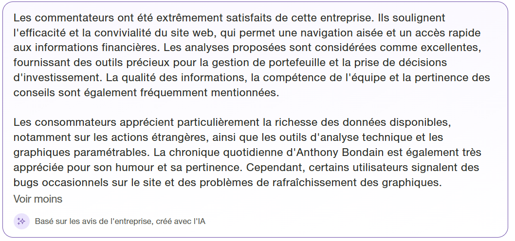 Et bien, sur les 577 avis Zonebourse laissés sur Trustpilot, la note est de 4,5/5 (pas mal !). Par ailleurs, le résumé des avis est plutôt rassurant et en ligne avec mon opinion.
