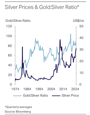 Avec un ratio de 65 le 18 décembre 2025, nous sommes loin du ratio de 104 d’avril 2025, ce qui est dû à l’explosion du cours de l’argent sur la période. Sur le temps long, vous voyez sur le graphique que dans les années 1970 / 1980, ce ratio était bien inférieur. Il y a donc peut-être encore une fenêtre de tir pour investir dans l’argent ?