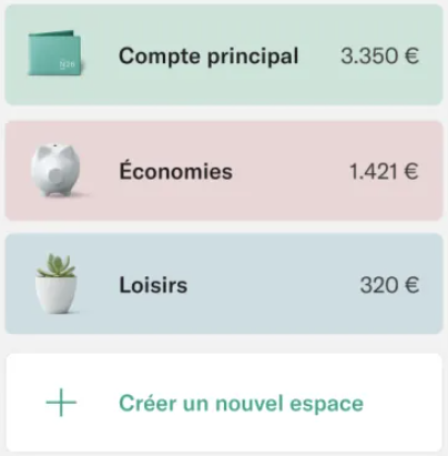 - La création de sous-comptes ou “Espaces” en euros, que vous avez la possibilité de partager (avec N26 Go et Metal), afin d’épargner ou régler des dépenses, seul ou à plusieurs.