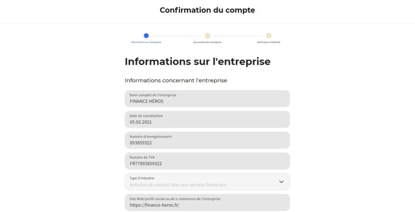 Ensuite, vous devrez fournir des informations sur votre entreprise (ex. nom, numéro de TVA, adresse du siège social) ainsi que des documents sur l’entreprise, typiquement un Kbis.